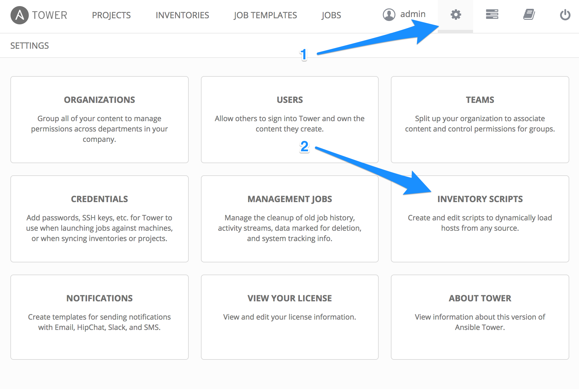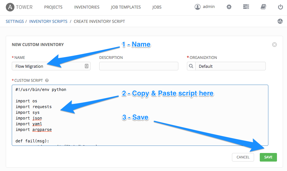Second open your Ansible Tower installation and navigate to the Create Inventory Scripts page.