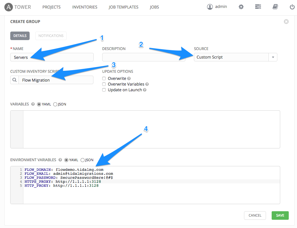 Each key for groups is any arbitrary name that will define the group in Ansible Tower. Each group accepts two keys.