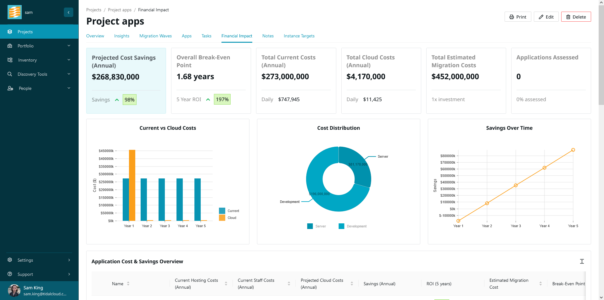 Tidal Accelerator empowers you to construct a compelling business case by visualizing the financial impact of your project. You can find your financial impact report by navigating to a project and clicking the ‘Financial Impact’ tab.