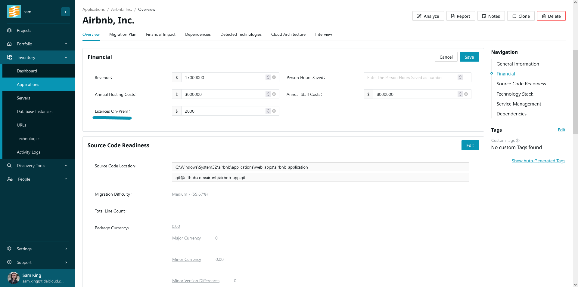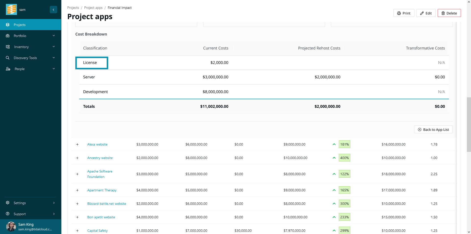 Arguably the most important data you’ll be dealing with is the current cost and cloud cost for your apps. For the most part, ‘cloud costs’ refers to rehost costs, however we do allow you to visualize and compare ROIs for alternative cloud migration transition types. More on that later.