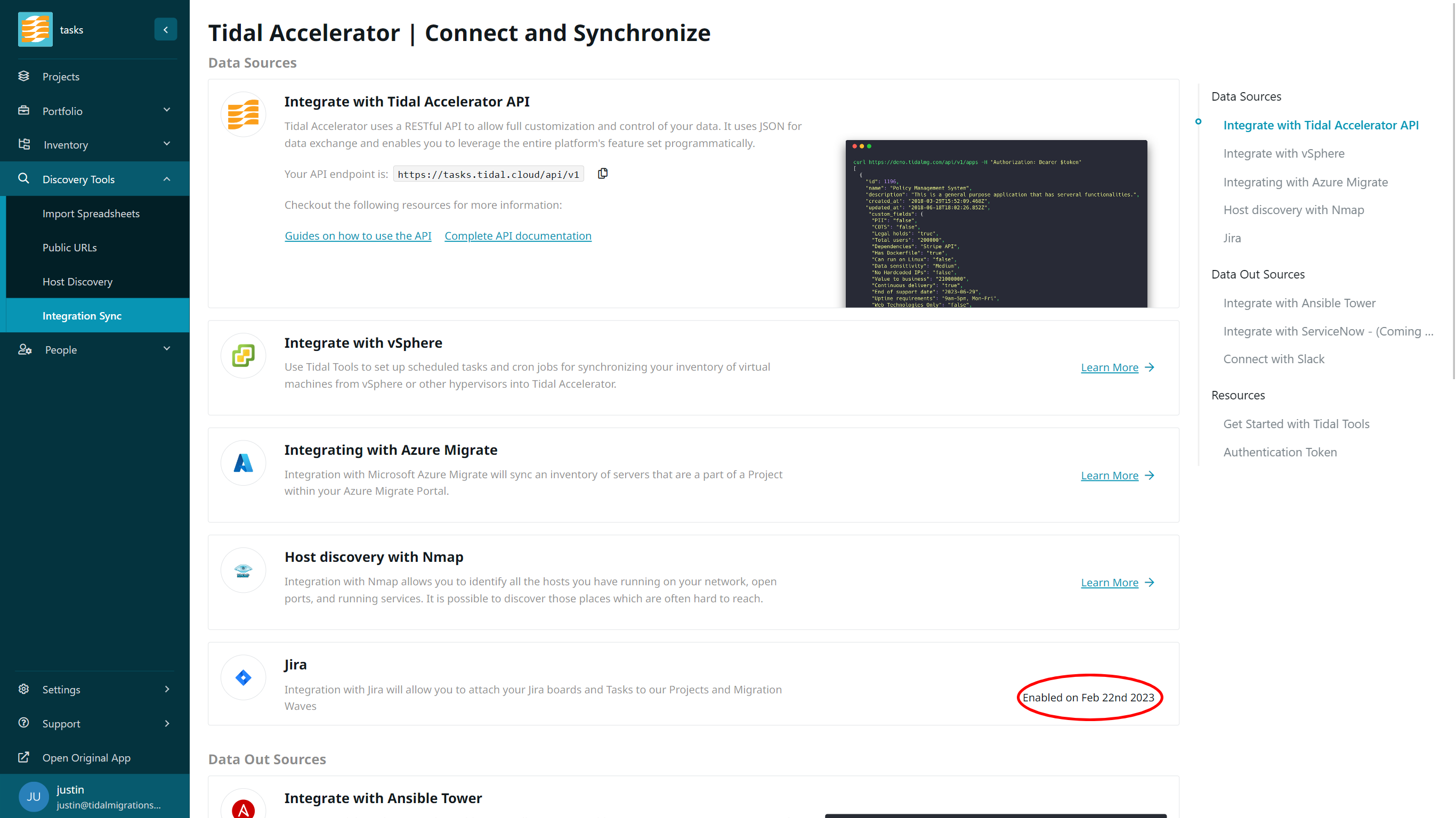 Finally, if everything has gone according to plan, you should be taken back to the integrations page on Tidal Accelerator. You should also see a date stamp, confirming when you enabled the integration within the Jira section of the page.