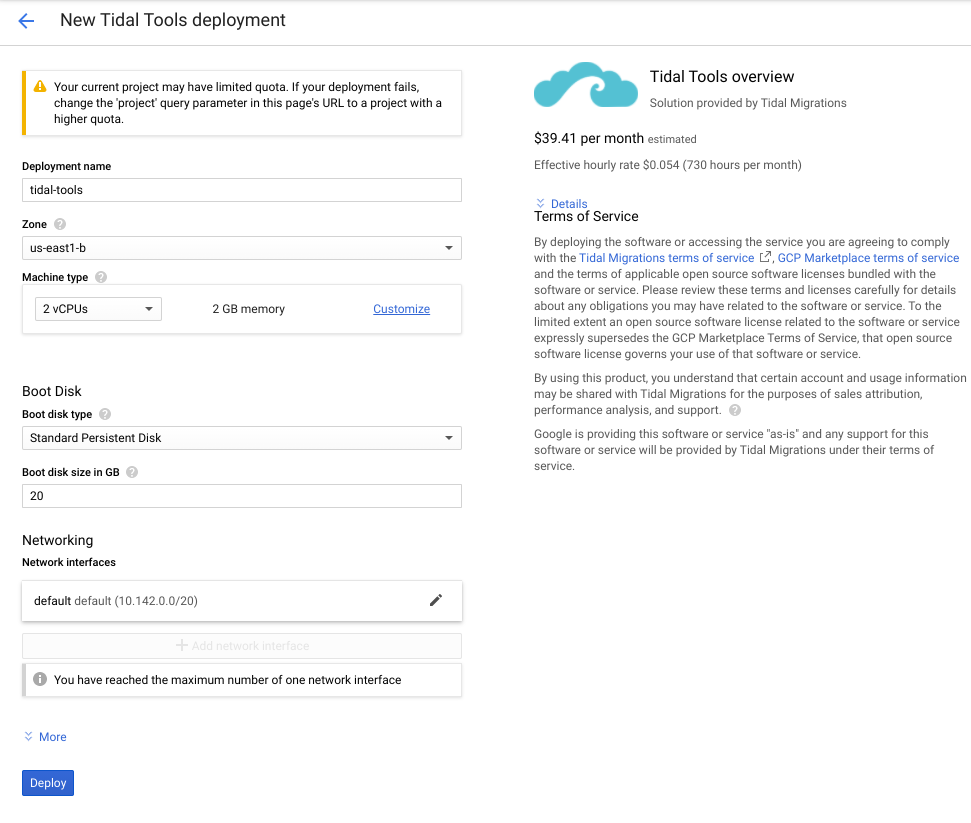 In the deployment section, enter your preferred zone and machine time, or use the defaults. Click